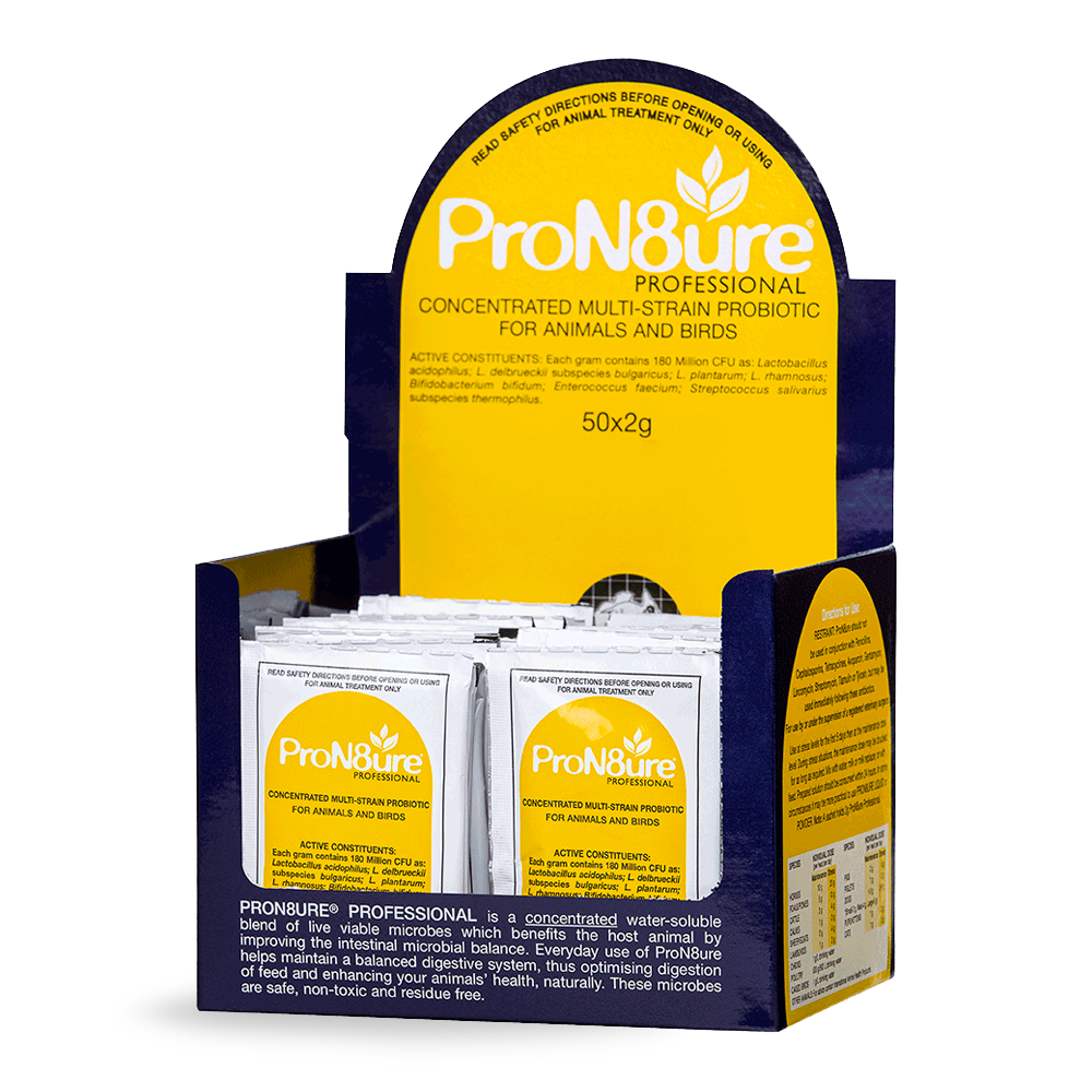 ProN8ure® has been well established in the market for about 20 years. With the continued support of veterinarians, nutritionists, farmers, wildlife carers and pet owners who have discovered a multitude of ways to maximise the health, immunity* and well-being of animals. ProN8ure® works by flooding the gut with millions of beneficial bacteria to restore the digestive system to a healthy gut function. ProN8ure® treats a range of issues including diarrhoea, poor appetite, loose stools, flatulence, digestive upsets, dietary changes, vaccination, worming, surgery, antibiotic treatment, weaning and travel sickness. ProN8ure® is suitable for all animals.
